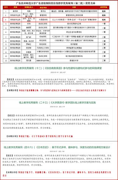 ⑥优秀课程建设。我院不断鼓励和引导教学团队和教师队伍提高教学质量,打造线上金课。我院已有多门课程作为优秀教学案例在学校得到推广,其中的《云上大学英语“录课+互动“平台+互动”新教学模式》在线教学优秀案例还在众多优秀案例中脱颖而出获得了学院或专业类优秀奖。