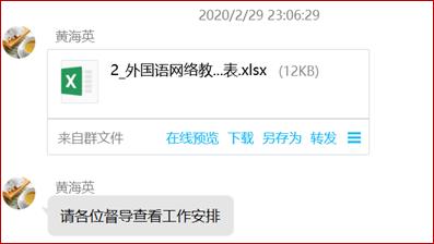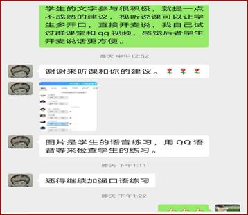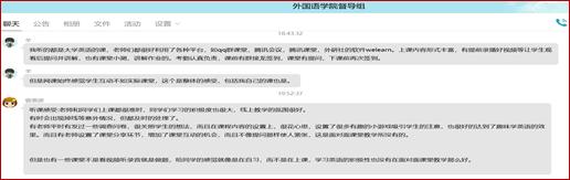 每一位老师均能够按照学校课表规定的时间,按时上课,没有出现任何迟到现象,大多数老师都能提前5到10分钟到位。老师们开课前都认真备好课,提前与学生对接与调试效果,并提前向学生发送相关学习材料。如外国语学院许昌富、王家明、张彦琳、吴庚堂等老师,他们备课相当充分,并提前通过Q群向学生发送大量的相关资料,以方便学生的预习,并作为课上讲授的参考和补充,有效地提高了授课效果。
