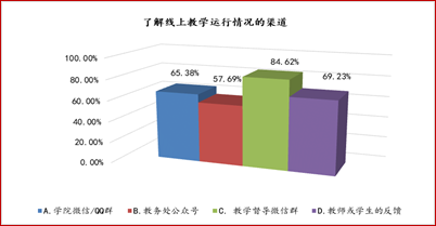 有65.38%的教学督导通过学院系QQ群,57.69%的教学督导是通过教务处微信公众号,84.62%的教学督导通过校级教学督导微信工作群,69.23%是直接通过教师和学生的反馈了解线上教学的情况,通过这几种渠道,教学督导及时了解线上教学运行情况,更好的开展教学督导工作。