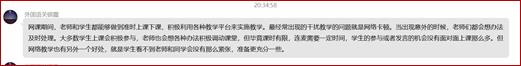 个别老师对在线教学不熟悉,设备调试不到位,致使学生看不清所展示的内容。个别老师教学方法陈旧、死板,只顾自己讲述,未能体现学生的主体性,甚至完全没有师生互动。此外,有些地方网络信号不给力,致使当地的学生无法很顺利地参与线上学习。