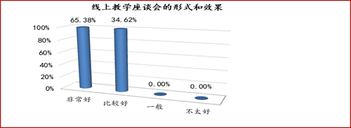 65.38%的教学督导认为线上教学座谈会的形式和效果是非常好的,其他的教学督导认为形式和效果是比较好,总体来说,校级教学督导对各自参加的座谈会分组开展情况都比较满意。