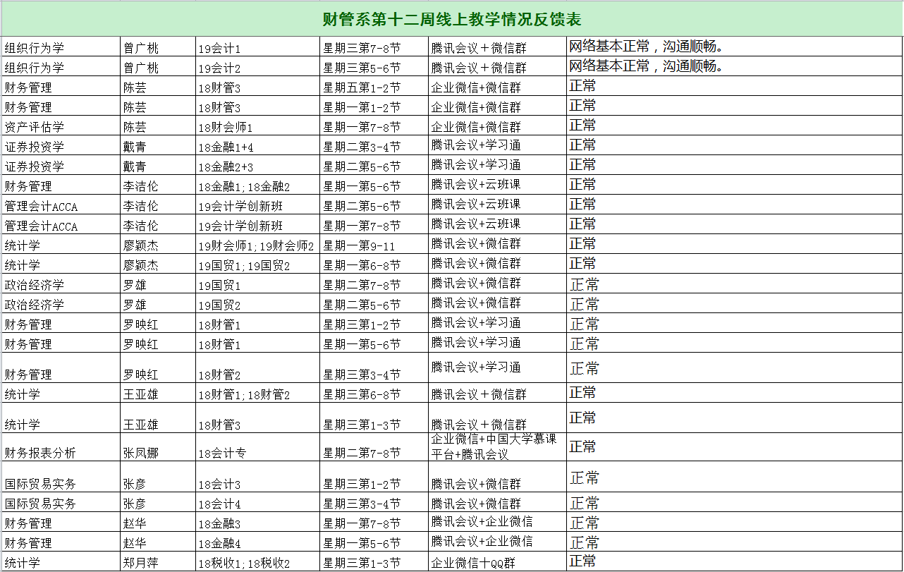 财经学院线上教学开课50门(含管理学院的经济学、会计学、微宏观经济学3门课程),会计信息系统克服困难安装软件开课,学院课程全部按要求开课。使用腾讯会议46门次,腾讯课堂30门次,学习通25门次,企业微信30门次,慕课8门次,QQ群课堂6门次,钉钉4门次,SPOC 1门次,录播2门次,学习强国视频 6门次 云班课6门课。由任课教师、教学信息员、系主任、学院督导组组成的四层教学质量保证体系继续履行督导职责,任课教师能依课表时间正常开课,课中严格管理,继续通过各种灵活方式监督学生课堂学习,从在线教学运行总体情况来看,教师们授课内容丰富,在线教学平台使用熟练,学生们在线学习积极性高,在线互动较好,在线学习效果基本达到了预期目的。教学信息员按要求及时反馈学生学习具体情况,系主任、学院教学督导按要求完成听课任务。