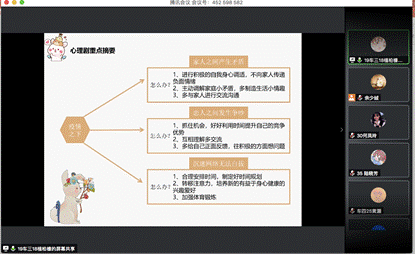 在上课模式方面,学生处线上教学继续采用“在线课程资源+线上直播辅导”的方式,教师们通过腾讯会议、企业微信、QQ群课堂等进行线上直播,采用超星学习通平台进行微课学习、签到考勤、过程监控、作业布置提交等,教师们已经熟练掌握各种平台。同时在教学过程中注重学生的参与与反馈,不断创新改进教学理念和方式。总体线上教学开展情况良好。