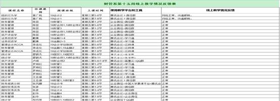 财经学院线上教学开课50门(含管理学院的经济学、会计学、微宏观经济学3门课程),学院课程全部按要求开课。使用腾讯会议46门次,腾讯课堂30门次,学习通25门次,企业微信30门次,慕课8门次,QQ群课堂6门次,钉钉4门次,SPOC 1门次,录播2门次,学习强国视频 6门次 云班课6门课。由任课教师、教学信息员、系主任、学院督导组组成的四层教学质量保证体系继续履行督导职责,任课教师能依课表时间正常开课,课中严格管理,继续通过各种灵活方式监督学生课堂学习,从在线教学运行总体情况来看,教师们授课内容丰富,在线教学平台使用熟练,学生们在线学习积极性高,在线互动较好,在线学习效果基本达到了预期目的。教学信息员按要求及时反馈学生学习具体情况,系主任、学院教学督导按要求完成听课任务。