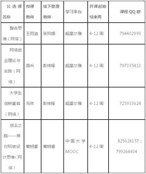 本学期共计开设4门创新创业类网络选修课,选课信息如下: