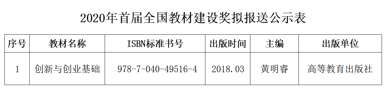 根据《国家教材委员会关于开展首届全国教材建设奖评选工作的通知》(国教材〔2020〕4号)要求,太阳集团开展了首届全国教材建设奖的申报评审工作。经教师个人申报、教学单位推荐、学校教材建设与管理委员会专家评审,拟推荐太阳集团黄明睿教师主编的《创新与创业基础》教材(详见列表)参加首届全国教材奖评选,现予以公示: