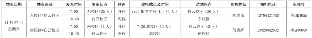 为方便大家前往观摩2021年11月27日(星期六)本科课堂教学观摩竞赛决赛(白云校区赛点),现将白云校区赛点交通班车(11月28日东校区赛点不安排交通班车)的具体乘车地点和时间通知如下: