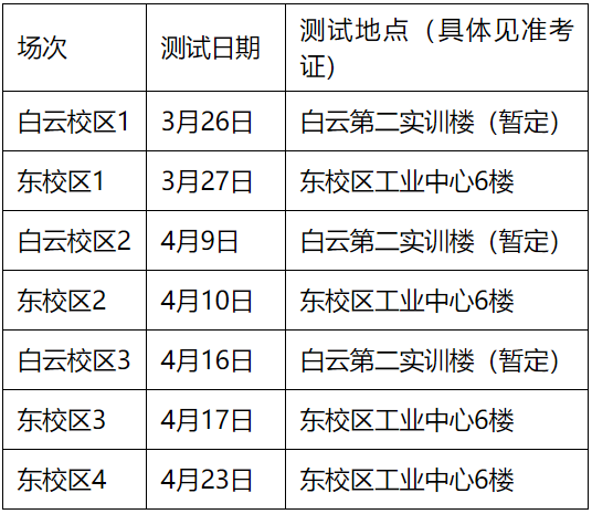 东校区、西校区、北校区学生请选择东校区(校本部)考场,白云校区学生请选择白云校区考场。已在省内其它测试站报名的考生不得重复报名。考试名额有限,报满则止。