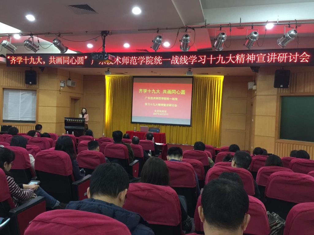 为学习宣传贯彻党的十九大精神,落实学院党委“五讲四个一百”关于“部门六长”重点讲的工作部署,12月27日,学院统战部在校本部讲学厅组织召开“齐学十九大、共画同心圆”统一战线宣讲研讨会。各民主党派基层组织成员、无党派代表人士、各二级党组织统战委员共计100余人参加了会议。统战部部长李琴、统战部副部长黄文浩,5个民主党派基层组织负责人分别就十九大与统一战线进行了深度的解读及宣讲。李琴主持研讨会。