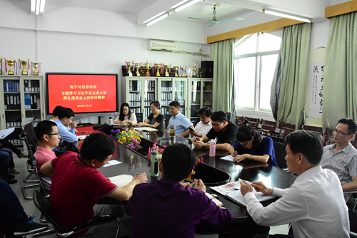 会上,大家认真学习习近平总书记在北京大学师生座谈会上的重要讲话精神,一致表示要联系电子与信息学院的实际,切实把习近平总书记重要讲话精神贯穿到各项工作中。