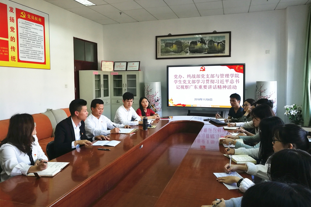 根据学校学习贯彻习近平总书记视察广东重要讲话精神有关工作部署,11月8日,党办、统战部支部党员同志深入管理学院、光电工程学院、美术学院、音乐学院的学生党支部,与学生党员及入党积极分子共同学习贯彻习近平总书记视察广东重要讲话精神。