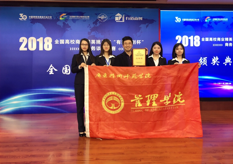 11月23日-25日,由教育部高等学校经济与贸易类专业教学指导委员、中国国际贸易促进委员会商业行业委员会主办,中国国际贸易促进委员会商业行业分会承办,商业国际交流合作培训中心、有道商创(深圳)科技有限公司协办的2018年全国高校商业精英挑战赛“有道商创杯”商务谈判竞赛总决赛在对外经济贸易大学国际交流大厦举办。我院管理学院学生参赛队伍(参赛学生:张文靖、陈洁英、魏欣、周冠英;指导教师:林晨、杨继福、易建华)获全国总决赛二等奖。
