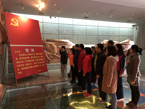 纪念馆里,外国语学院一行举行了庄严的入党宣誓仪式。党员同志面对鲜红的党旗,举起右手,在贺显斌院长的带领下,重温了入党誓词,铮铮誓言响彻整个纪念馆。