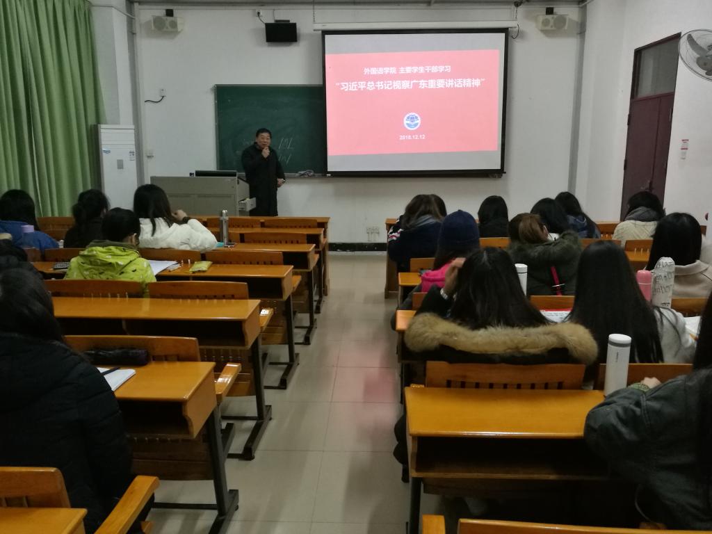 12月12日,外国语学院组织主要学生干部在白云校区一教109学习“习近平总书记视察广东重要讲话精神”。外国语学院党委杨伟光副书记、各年级辅导员、管班党员、团总支和学生会主要学生干部、各年级助辅、各中主心主任、党建中心和思政中心全体成员参加了本次学习。