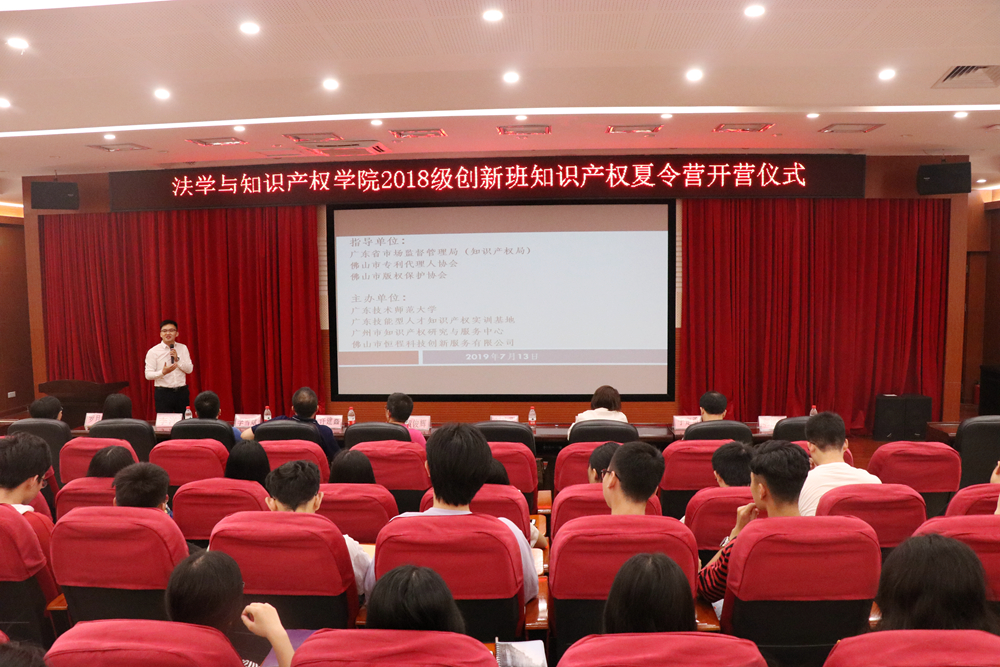 为探索知识产权人才培养新模式,切实培养一批具有较强实务能力的知识产权人才,吸引更多在校学生认识和关注知识产权行业,提高师生对知识产权实务的认知水平,7月13日,法学与知识产权学院在白云校区三教104报告厅举行2018级创新班知识产权夏令营开营仪式。法学与知识产权学院全体党政领导班子、党政办公室、辅导员,佛山市恒程科技创新服务有限公司总经理刘咏平、知识产权专员及2018级法学创新班全体学生参加了开营仪式。仪式由法学与知识产权学院副院长郭洪波主持。