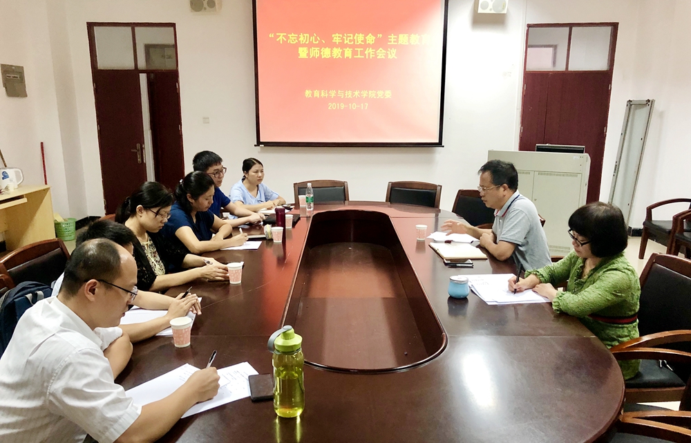 根据学校“不忘初心、牢记使命”主题教育实施方案和学校党委《关于开展2019年师德建设主题教育月活动的通知》要求,为进一步推进师德师风建设工作,提高教职工的思想政治素质和职业道德修养,建设一支师德高尚、业务能力强的教师队伍,10月17日,教育科学与技术学院在白云校区一教315召开“不忘初心、牢记使命”主题教育暨师德教育工作会,学院党委书记林启词、副书记吴水爱和近两年新进全体博士参加了会议。