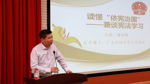 潘高峰从中西宪法变迁谈起,论及“依宪治国”的丰富内涵,认为在宪法深厚悠久的历史变迁中,可以深刻感受到宪法的历史价值与重要意义,可以从现今国家治理中读懂“依宪治国”的重要内涵。如何从认识宪法、尊重宪法到依宪治国?潘高峰从理论到实践进行分析,还专门介绍了不久前在广东外语外贸大学举办的第四届全国学生“学宪法 讲宪法”活动广东省决赛,认为可以从准备演讲比赛、知识竞赛两个赛项时以赛促学领会宪法精神。