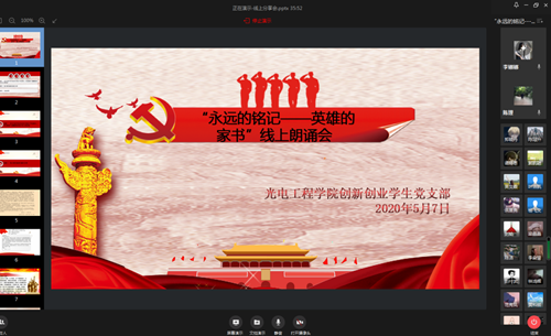 为深入学习贯彻习近平总书记在今年五四青年节对青年工作的重要指示精神,光电工程学院创新创业学生党支部日前组织开展了“永远的铭记——英雄家书”朗读会系列活动。