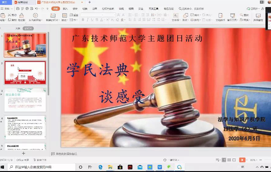 6月3日,法学与知识产权学院党总支布置系列专题学习安排,通过学院理论中心组、支部会议、主题党日活动、主题团日活动、专题党课等形式,深入学习、宣传、贯彻《民法典》。6月10日,学院召开理论中心组扩大会议,学院党政领导班子、系部主任和支部书记一同学习了2020年全国两会精神以及《民法典》。6月5日至10日,学院学生创新创业党支部、各班团支部组织专题线上学习活动,通过播放视频、知识抢答、交流互动等环节,使专题学习更直观、更贴近生活。