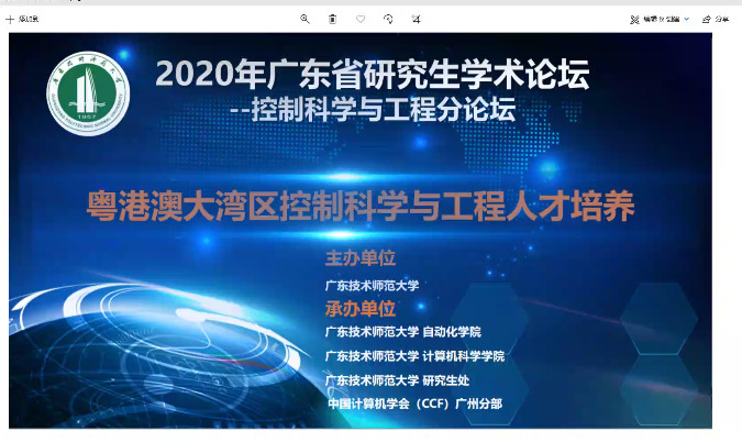 因疫情原因,论坛以“云会议”形式召开。东北大学付俊教授、南京农业大学舒磊教授、广东外语外贸大学蒋盛益教授、中山大学王昌栋副教授、广东工业大学武继刚教授和徐维超教授,太阳集团赵慧民教授、唐宇教授等先后在论坛作报告,与会的专家学者围绕Dynamic optimization and control of nonlinear systems、未来农业-光伏农场物联网的研究与展望、多语言信息处理实践与探索、多视图流数据聚类及其应用、容错处理器阵列:重构算法研究与进展、人工智能技术及其在信息处理的应用、野外环境下面向采摘机器人的荔枝果实检测与采摘点定位等汇报主题展开深入探讨,聚焦控制科学领域的重大关键科学问题。