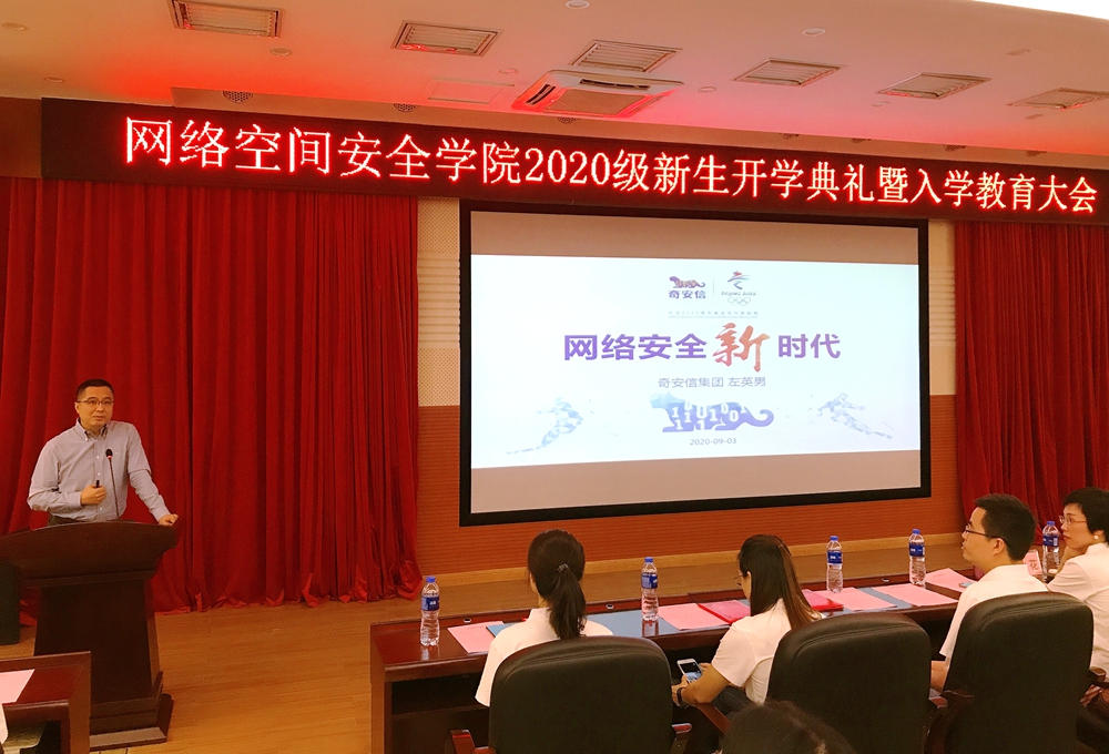 10月10日上午,网络空间安全学院在白云校区三教报告厅举行2020级新生开学典礼暨入学教育大会。奇安信科技集团股份有限公司合伙人、副总裁左英男,企业导师团、网络空间安全学院全体教师和99名首批新生参加了典礼。