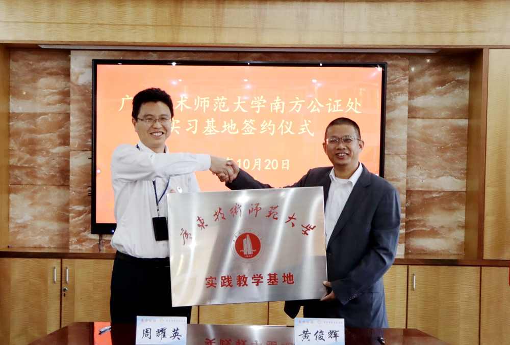 10月20日,法学与知识产权学院分别在广州公证处、南方公证处举行实践教学基地挂牌仪式。广州市公证处主任韦翠坚、副主任郑文敏,南方公证处副主任周耀英、罗春茹,法学与知识产权学院院长黄俊辉、副院长郭洪波、法律系主任李小萍、朱腾伟博士等参加了仪式。