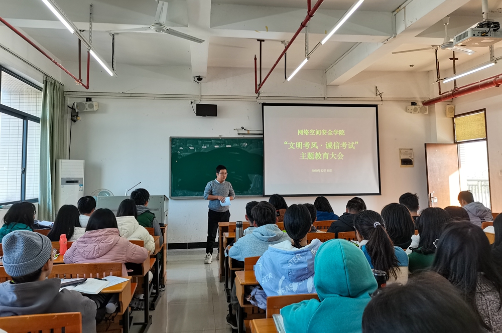 临近期末,为进一步加强学风建设,营造诚信、公平、公正的考风考纪,引导学生做诚信人,说诚信话,行诚信事,12月18日,网络空间安全学院召开“文明考风•诚信考试”主题教育大会,学院全体同学参加了活动。