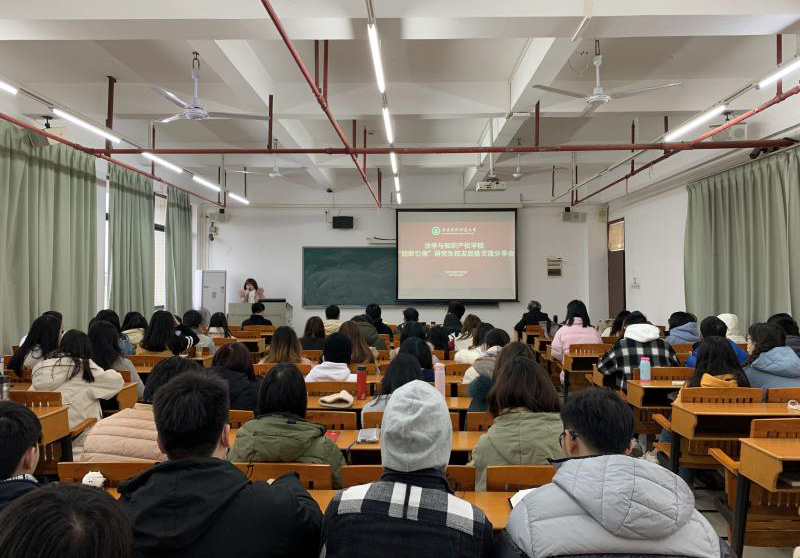 黄筠、林小慧、蔡淑伦在会上感谢法学与知识产权学院老师们在考研工作上的悉心指导,详细介绍了考研院校及专业选择、复习资料整理、应试心态调整等情况,并就考研复习规划、考研与法考备考的时间安排、考研英语备考等问题与同学们进行交流互动。