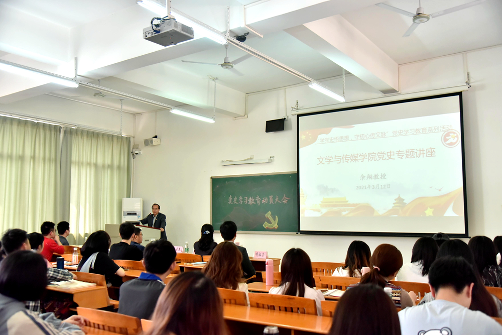 根据中央、省委、省委教育工委和学校党委的部署要求,为深入学习领会习近平总书记在党史学习教育动员大会上的重要讲话精神,从党史中汲取继续前进的智慧和力量。3月12日,文学与传媒学院召开党史学习教育动员部署大会暨“学党史悟思想,守初心传文脉”党史学习教育专题讲座。学院党委书记李双贵作党史学习教育动员讲话,学报编辑部主任余翔教授应邀作专题讲座。学院党政领导班子成员、党支部书记、师生党员与入党积极分子约120人参加了大会。