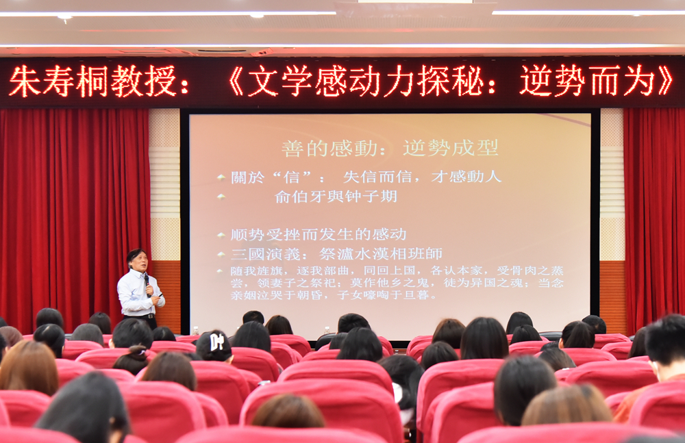 3月19日下午,澳门大学中文系系主任、博士生导师、中国作家协会会员、“珠江学者”特聘教授朱寿桐教授应太阳集团文学与传媒学院邀请,到白云校区学术报告厅为师生作题为《文学感动力探秘:逆势而为》的学术报告,带来了一场别开生面的文学盛宴。讲座由文传学院副院长佘爱春教授主持,300多名师生聆听了演讲。