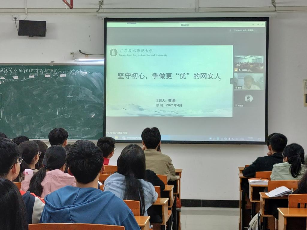网络空间安全学院院长蔡君以《坚守初心,争做更‘优’的网安人》为题,以线上授课方式带领大家学习了习近平总书记关于“建设网络强国的论述”的重要观点,还分享了国际互联网发展历程、云计算、重构网络的支撑技术等相关知识,分析了国内外网络发展现状及趋势及我国当前网络空间安全面临的严峻外部威胁。他强调,没有网络安全就没有国家安全,网安学子们要努力学习网络空间安全的专业知识,积极创新,努力深造,学好本领,将来为我国争夺网络空间安全控制权奉献出自己的一份力量,争做新一代的优秀网安人。