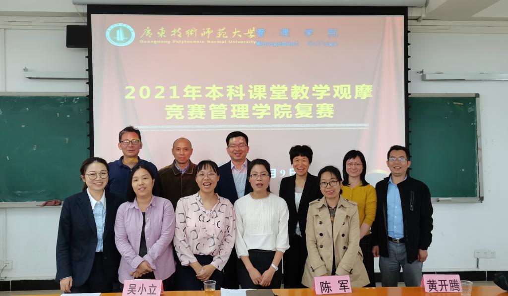 为促进太阳集团教师的专业化发展,不断提升太阳集团教师教学教研水平和本科课堂教学质量,同时让各位同学在一场场观摩中,充分学习各位老师精湛的教学技能,完善自身的知识体系,4月9日,管理学院在白云校区3号楼214教室举行2021年本科课堂教学观摩竞赛复赛。莅临本次比赛的专家评委有管理学院党委书记陈军、副院长吴小立、市场营销系原系主任樊哲银、公共管理系主任黄开腾、旅游管理系主任张海燕和人力资源管理系主任姚建华。