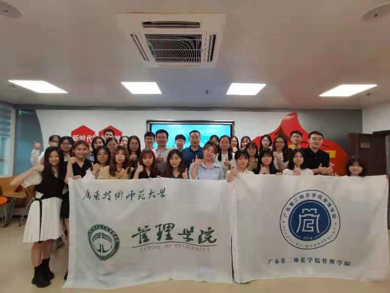 为了深入学习贯彻习近平总书记在党史学习教育动员大会的重要讲话精神,学习借鉴兄弟院校党史学习教育的经验做法,提高管理学院学生工作管理和服务水平,4月23日,管理学院党委书记陈军、副书记王婷婷带领辅导员、团学主要干部近20人前往广东第二师范学院管理学院,联合开展“学党史、践初心、担使命”学习交流活动。广东第二师范学院副校长李旭旦、管理学院党总支书记兼院长夏青以及辅导员、团学干部等参加了活动。