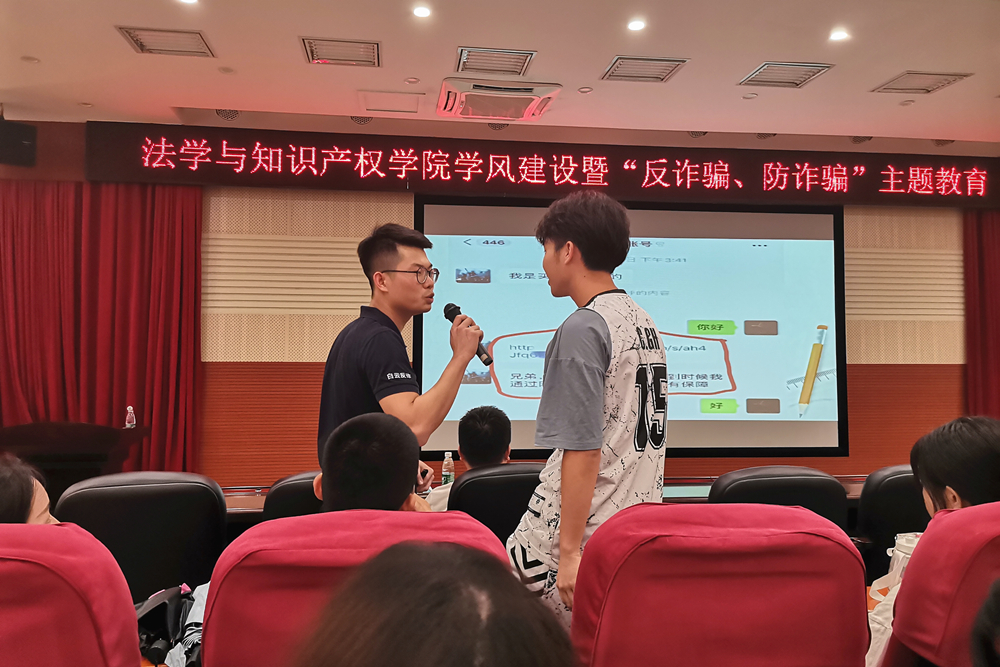 学党史,办实事。为了进一步加强反诈防骗宣传力度,不断提高师生防诈骗能力,创建优良校风、学风,5月19日,法学与知识产权学院在白云校区三教报告厅组织开展了学风建设暨“反诈骗、防诈骗”主题教育活动。广州市公安局白云分局“云安”宣讲团谢晓俊警官,法学与知识产权学院党委副书记李雪斌,辅导员以及2019级全体学生参加了主题教育。