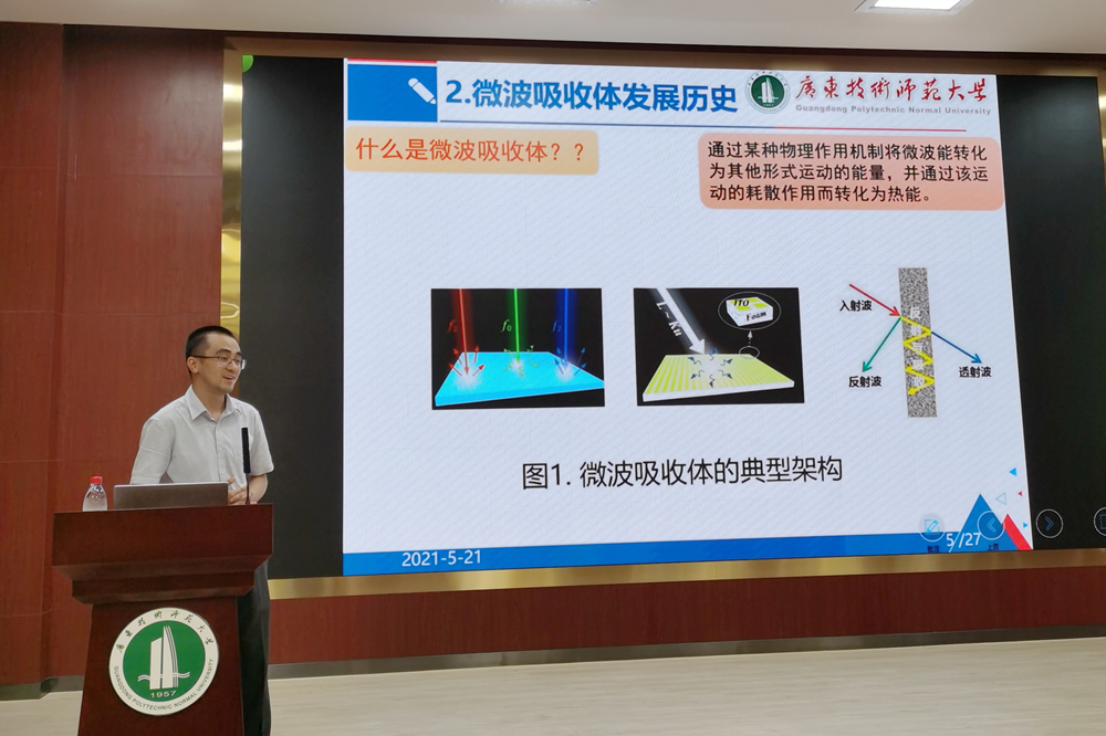 赖森锋博士在论坛上作了题为《微波吸收体的研究进展与未来展望》的报告。赖森锋深入浅出地阐述了微波吸收发展历史、3D透明柔性微波吸收体以及微波吸收体的未来展望,他结合自身的科研经验,鼓励研究生培养科技创新精神,敢于突破、敢于科研。精彩报告收获了在场师生的阵阵掌声。