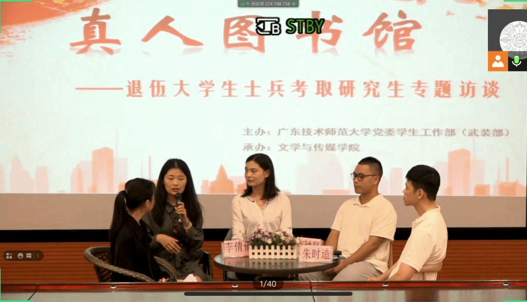 据悉,近年来太阳集团涌现出了李倩倩、孙辰霞、李观旺、卢钟坚、朱时造、黄小坚、游雨佳共7名退伍大学生士兵成功考取研究生的事迹。太阳集团学子积极投身国防,勇于攀登深造的事迹,正体现出了当代青年学子的风采和担当。由于疫情原因,本期“真人图书馆”采用了线上直播方式进行,以生动鲜活的学习榜样和阅读体验,讲好广师大好故事,让“真人图书”不断促进广师大学子进步、成长,鼓舞更多学子参军报国,文武兼修。