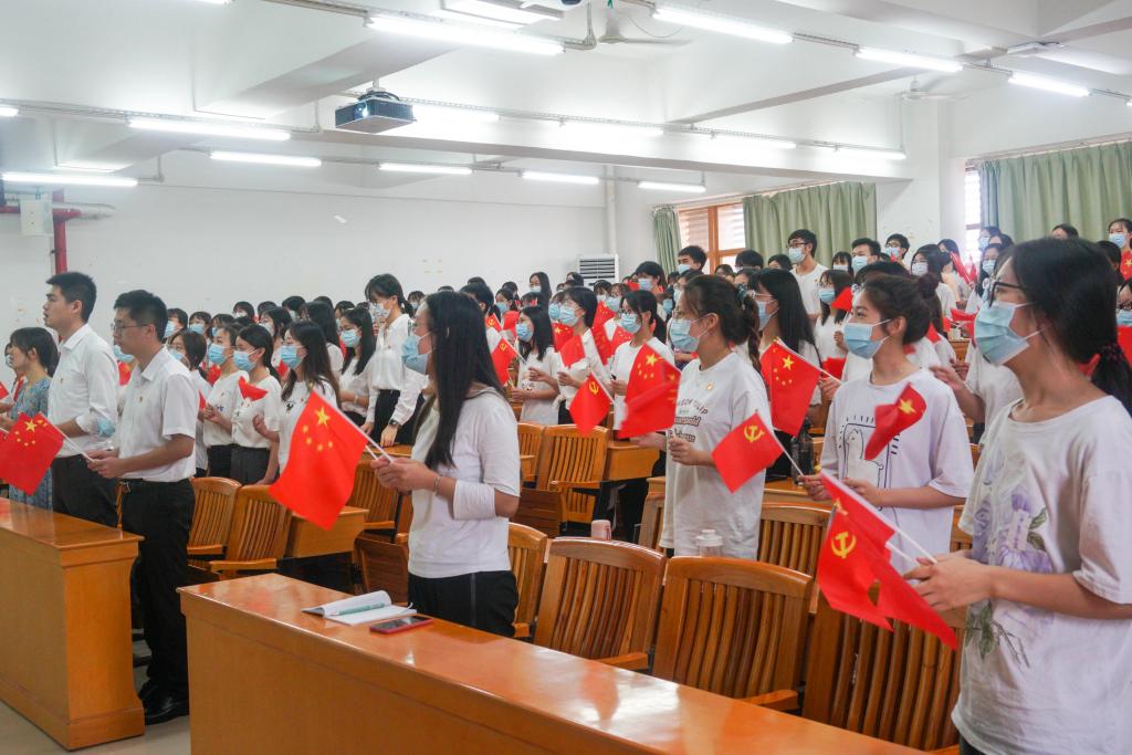 收看庆祝大会过后,在专职组织员吴晨阳老师的带领下,全体学生党员重温入党誓词,大家佩戴党员徽章,举起右手,面向鲜红的党旗庄严宣誓。最后,全体人员手持党旗和五星红旗,共同齐唱《没有共产党就没有新中国》,表达对党和祖国的无限热爱。