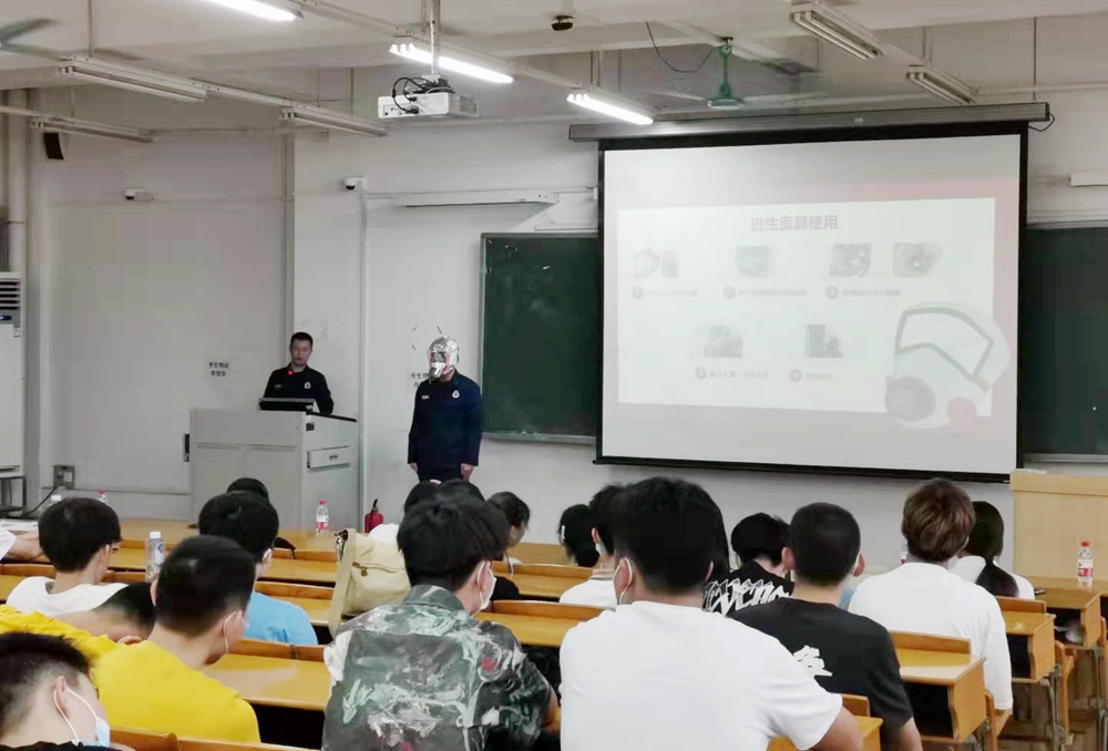 在东校区第二教学楼302,邱洋滨为学生进行了消防安全知识理论授课。邱洋滨讲授了丰富的消防安全知识内容,对学生进行了一次生动、全面的讲解。邱洋滨以近期国内外真实且触目惊心的火灾案例为切入点,强调消防知识基础教育的重要性,引出“防”胜于“消”的观点,学习消防知识的目的在于培养突遇火灾时的灵活应变能力。邱洋滨还穿插讲解了各种火灾特点,教授火场逃生的基本方法。
