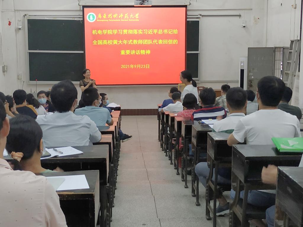 9月23日,机电学院组织全体教工专题学习习近平总书记给全国高校黄大年式教师团队代表回信精神。学院党委书记陈郁芬带领全体教师学习了回信内容,同时再次重温了习近平总书记关于教育和师德师风的部分重要论述。陈郁芬指出,全体教师要牢记习近平总书记的殷殷嘱托,坚定理想信念,落实立德树人根本任务,涵养高尚师德,切实担当起为党育人、为国育才的光荣使命,为创建中国特色世界水平技术师范大学续写奋进之笔。