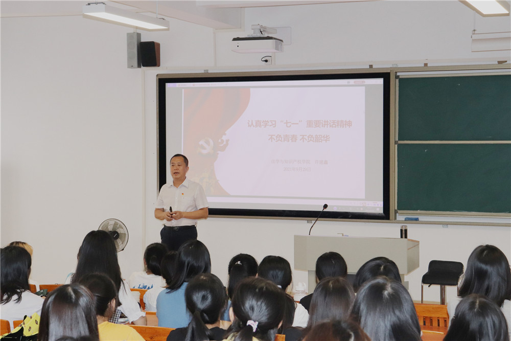 许建鑫以《“认真学习‘七一’重要讲话精神 不负青春 不负韶华》为主题展开授课,带领2021级法学3班、4班同学深入学习习近平总书记“七一”重要讲话精神。他回顾了中国共产党百年的光辉历程,引导同学们坚定不移听党话、感党恩、跟党走。他同时进行校史校情、疫情防控、学风和纪律安全教育,要求同学们坚定信念信仰,认真学习习近平新时代中国特色社会主义思想,自觉参加党史学习教育,尽快适应大学学习生活,认真思考、规划职业生涯,养成良好的学习、生活、锻炼习惯,从自身做起、从身边小事做起、从现在做起,努力做一名合格的社会主义建设者和接班人。