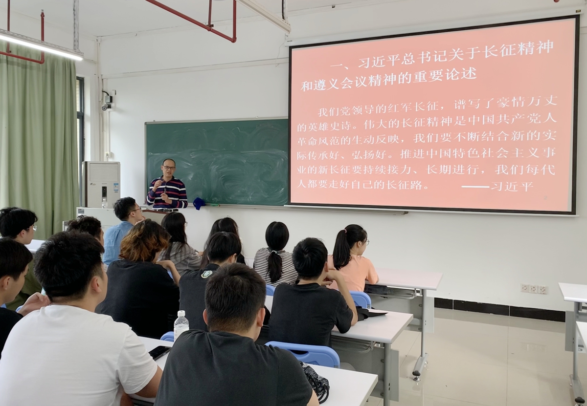 为纪念长征胜利85周年,持续推进党史学习教育走深走实,11月3日,光电工程学院党委书记罗君辉以“从革命歌曲《遵义会议放光辉》中汲取奋进的力量”为题,在白云校区第二教学楼202室为2019级光电1班和2班讲授专题党课。这是光电工程学院党委“欣赏革命歌曲,学习党的历史,坚定理想信念”系列活动之一,通过欣赏《长征组歌》第三曲《遵义会议放光辉》,学习其中蕴含的党史知识,教育引导学生从中汲取奋进的力量。