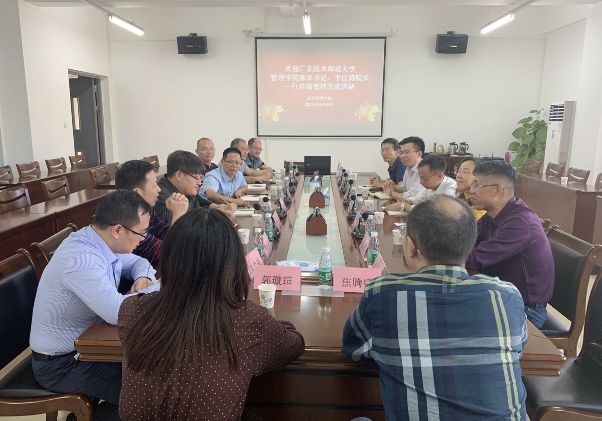 管理学院党委书记陈军介绍了管理学院的基本情况,对经济管理学院的热情接待表示衷心的感谢。他表示,要认真学习经济管理学院办学治院的先进经验,进一步加强合作交流。管理学院院长李江涛介绍了管理学院的学科专业建设、本科人才培养、年轻博士培养等方面的情况,希望两个学院在各个领域加强沟通合作。接着,双方围绕党建与业务双融双促、高层次人才引进、科研项目申报、专业科技竞赛、实验实训室建设以及学生实验技能培训等进行了深入探讨和交流。
