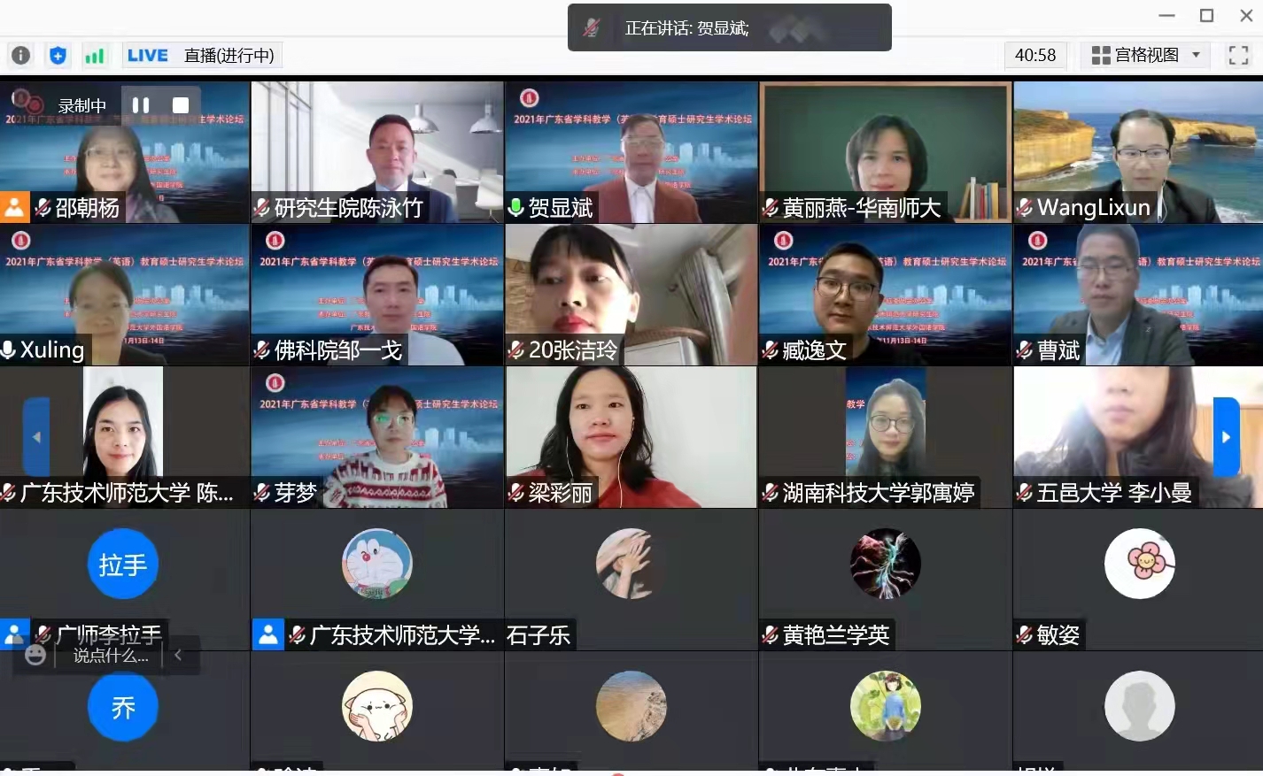 论坛邀请了北京师范大学、华南师范大学、香港教育大学等学科教学(英语)研究生培养单位的七名专家做学术讲座,邀请了广东省教育研究院、海珠区教育发展研究院的教研员做专题报告。主旨报告围绕五个方面:认知语言学、语料库语言学、人工智能等对外语教学的启示或影响,对语法和语法学习与教学的重新认识,英语教师应具备的评价素养,高中英语新课标的理解与实施,学科教学(英语)硕士研究生的论文选题与写作。