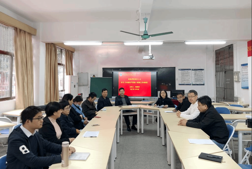 为学习贯彻《中国共产党统一战线工作条例》(以下简称《条例》),进一步提升统战工作科学化、规范化、制度化水平,11月23日下午,机电学院在西校区教学楼104召开党外人士学习《条例》研讨会。会议由学院党委书记陈郁芬主持。机电学院各民主党派包括民盟、民建、九三学社成员、无党派人士以及部分高级职称的共产党员代表参加了会议。