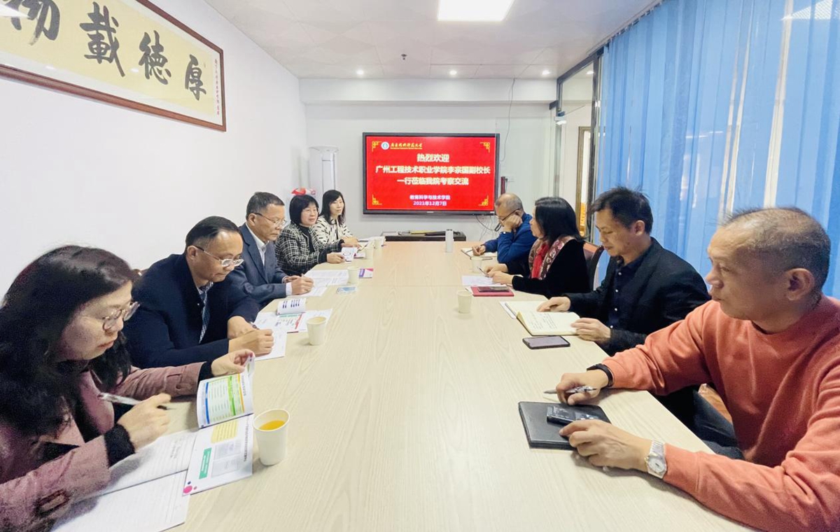 12月7日上午,广州工程技术职业学院副校长李宗国,教务处副处长兰先芳、李红丽,信息工程学院院长王世安、副院长吴明珠等一行五人,到教育科学与技术学院进行调研交流。学院党委书记张旭日、院长陶红,副院长谢德新、党政办主任常锋峰参加座谈会。
