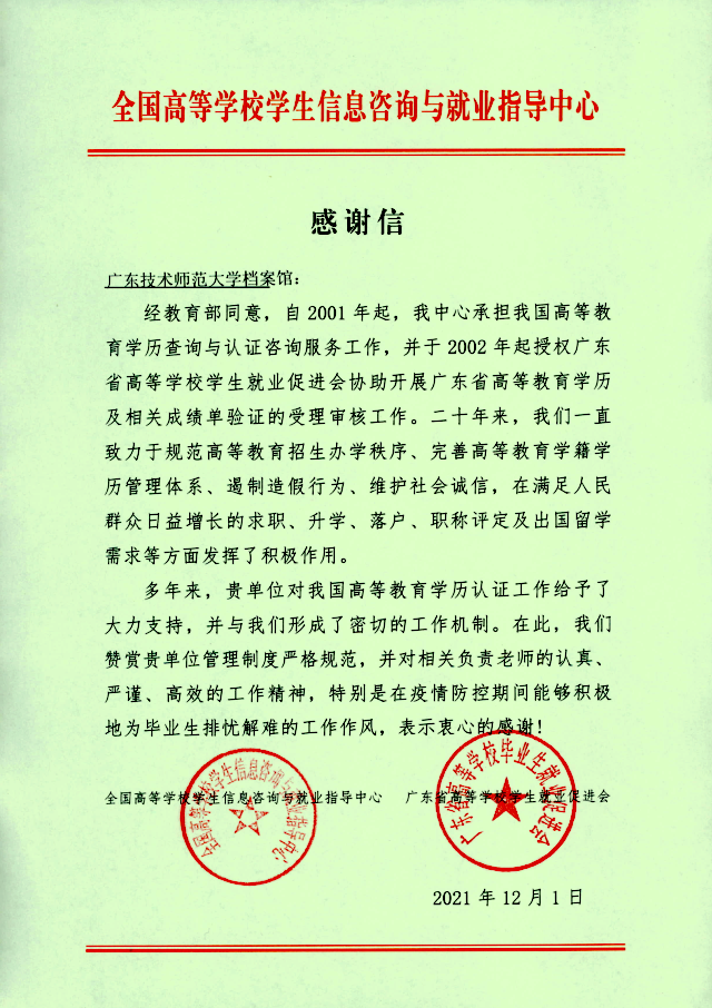 感谢信赞扬了太阳集团档案馆严格规范的管理制度,并对太阳集团档案馆长期对高等教育学历认证工作的大力支持以及相关负责老师认真、严谨、高效的工作精神,特别是在疫情防控期间积极为毕业生排忧解难的工作作风表示衷心感谢。