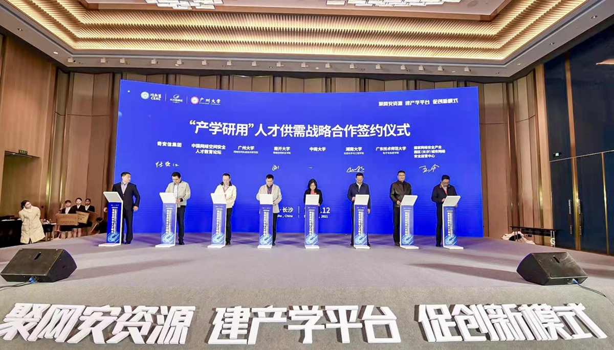 在“产学研用”人才供需战略合作签约仪式上,电子与信息学院作为高校代表之一,与南开大学网络空间安全学院、中南大学计算机学院、湖南大学信息科学与工程学院、广州大学网络空间先进技术研究院,联合网教盟、国家网络安全产业园区(长沙)城市网络安全运营中心和奇安信签署战略合作协议,结合各高校、企业强大的人才梯队和科研力量,共同打造学历教育、职业培训、校企合作的人才培养体系。会上,相关合作院校代表和企业代表为电子与信息学院授牌“人才培养实训基地”。