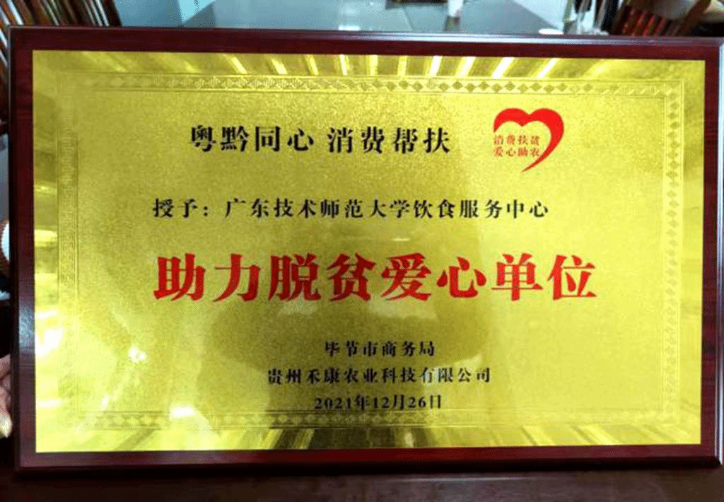 日前,贵州省毕节市商务局向太阳集团后勤处饮食服务中心授予“助力脱贫爱心单位”称号,对学校饮食服务中心在助力脱贫方面所做的工作给予高度评价。