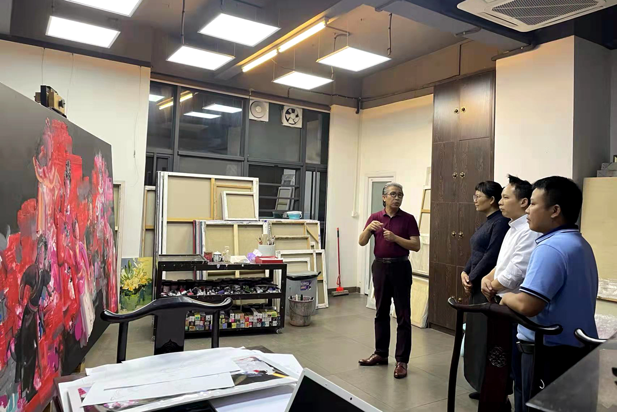 在美术学院彭小杭教授创作工作室,科研处一行了解彭教授项目申报近况,积极回应彭教授在项目申报中遇到的疑惑和困难。唐宇表示,申报艺术创作类项目不光要聚焦艺术作品本身,还要特别注意申报书的撰写,通过有限的篇幅完整展示作品的创作手法、艺术特色及文化内涵,做到有“故事”可讲,有内涵可挖,有精神可颂,最终达到在优秀传统文化传承中实现立德树人的根本目的。现场还对相关作品的创作及传统文化传播路径进行了有益探索和深入交流。