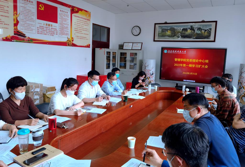近日,管理学院党委理论中心组在白云校区一教402召开2022年第一期专题学习扩大会,会议主题是深入学习习近平总书记在全国两会期间的重要讲话精神和全国两会精神,学院党政领导班子成员、党委委员、各系主任、教工党支部书记和教师代表参加了会议。会议由学院党委书记陈军主持。